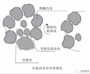 污水廠內(nèi)的污泥是從污水中來(lái)的,因此在污泥中必然存在大量的水分。我們來(lái)看下面這張圖,