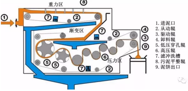 這是一個典型的濃縮壓濾一體機(jī)的構(gòu)造圖,從污泥濃縮壓濾一體機(jī)的結(jié)構(gòu)上來看,壓濾機(jī)分為三個部分,一部分是重力區(qū),在這個區(qū)間,主要是加了絮凝劑的污泥在污泥平攤輥的作用下,平攤到壓濾機(jī)上部平整的濾帶上,這部分濾帶沒有擠壓作用,僅僅是依靠加藥后的污泥和水分離開,水依靠重力作用通過濾帶流走的;第二部分進(jìn)入漸變區(qū),這個區(qū)域,開始有了第二條濾帶參與進(jìn)來,污泥開始進(jìn)入到一個上下兩條帶之間的位置,并逐漸受到上下兩條濾帶的包圍,并由寬變窄,形成一個漸變的區(qū)域,在這部分區(qū)域的污泥之間的水分在漸變的過程中得到一定的去除;第三部分進(jìn)入壓力區(qū),這部分濾帶上下開始強力擠壓,污泥中被絮凝藥劑剝離的顆粒之間的水分在壓力作用下從污泥中擠壓出去,通過濾帶流走。