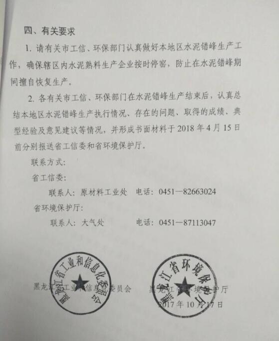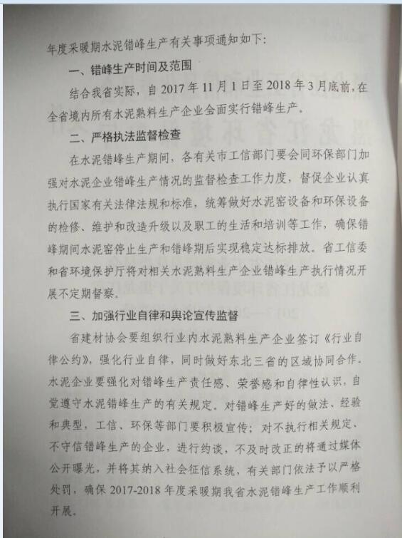 近日,黑龍江省工信委黑龍江省環(huán)保廳聯(lián)合發(fā)布《關于黑龍江省2017-2018年度水泥錯峰生產(chǎn)工作的通知》,將于2017年11月1日至2018年3月底前,在全省境內(nèi)所有水泥熟料生產(chǎn)企業(yè)全面實行錯峰生產(chǎn)。
