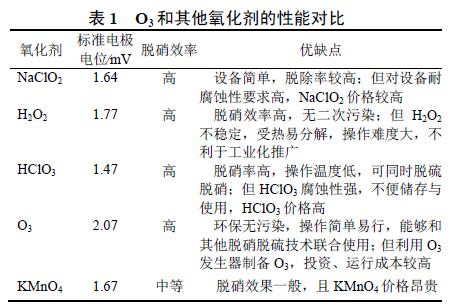 近幾年,關(guān)于O3氧化結(jié)合堿液吸收的新技術(shù)越來越多,MING等[34]開展了O3氧化與NaOH溶液吸收耦合的同時(shí)脫硫脫硝技術(shù)研究;SUN等[35]利用堿性的氧化鎂漿料作為吸收劑,研究了O3氧化協(xié)同氧化鎂漿液吸收的同時(shí)脫硫脫硝新工藝。O3可以很好地的和不同吸收劑及其他技術(shù)協(xié)調(diào)使用,擁有很強(qiáng)的使用靈活性,這為其應(yīng)用推廣提供了便利,O3氧化法應(yīng)用的關(guān)鍵在于如何降低O3的制取成本。O3和其他氧化劑的性能對(duì)比見表1。