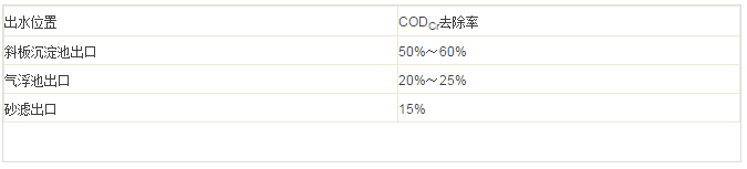 反應(yīng)槽采用推流式反應(yīng)槽,分為三格。第一格加堿將pH調(diào)高至10~10.5,加入CaCl2,第二格加FeSO4,第三格加混凝劑PAM,反應(yīng)后進(jìn)入斜板沉淀池進(jìn)行固液分離。三格停留時(shí)間分別為15min、15min、7.5min。斜板沉淀池表面負(fù)荷按2m3/m2˙h設(shè)計(jì)。一級反應(yīng)CODCr去除率為50%~60%。