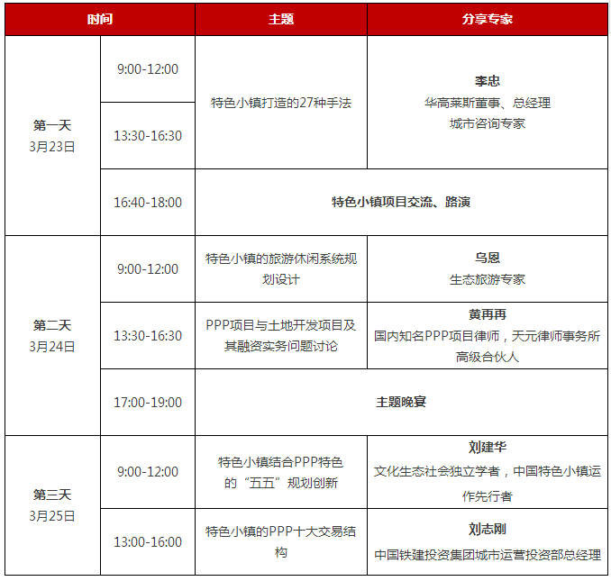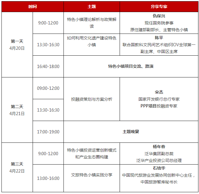 政策解讀、文旅特色小鎮(zhèn)實(shí)踐分享、投融資策劃與方案分析、特色小鎮(zhèn)投資運(yùn)營創(chuàng)新模式和產(chǎn)業(yè)生態(tài)圈構(gòu)建、如何利用文化遺產(chǎn)建設(shè)特色小鎮(zhèn)