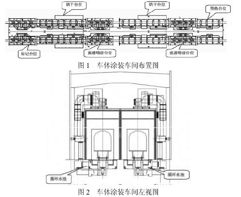 太原軌道交通裝備有限責任公司太原廠(以下簡稱“太原廠”)車體涂裝車間采用的就是濕式除漆霧的工藝流水線。車體涂裝車間布置及其左視圖如圖1和圖2所示。