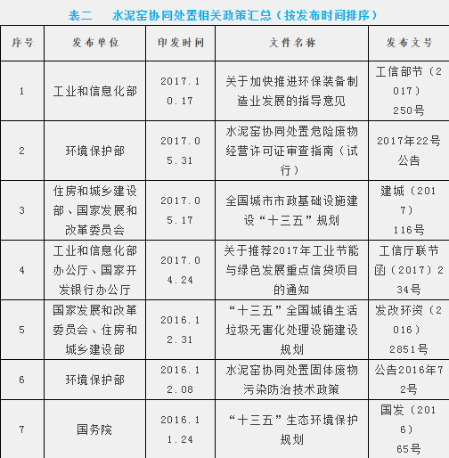 從2010年至2017年,與水泥窯協(xié)同處置相關(guān)的國務(wù)院和部委發(fā)布的政策已達(dá)26項(xiàng)之多(表二)。這些直接和間接支持水泥窯協(xié)同處置的政策創(chuàng)新和政府主管部門的直接推動,加快了水泥窯協(xié)同處置的創(chuàng)新發(fā)展。但遺憾的是,水泥窯協(xié)同處置企業(yè)迄今仍然不能享受國家對生活垃圾處置的財政補(bǔ)貼。其實(shí),在市場機(jī)制下,他們真正需要的是公平競爭環(huán)境。筆者相信,長風(fēng)破浪會有時,不用多久,水泥窯協(xié)同處置生活垃圾一定會成為政府不可或缺的好幫手。