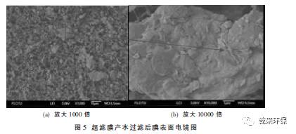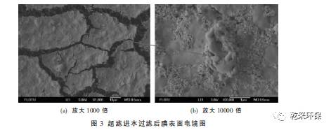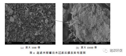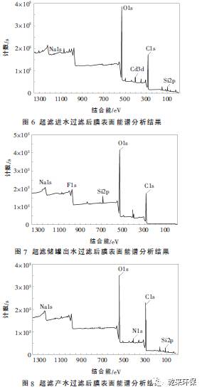 ③ 超濾進(jìn)水、超濾水儲(chǔ)罐出水、超濾產(chǎn)水過濾膜表面的SEM分析顯示, 膜面污染物主要成分是微生物產(chǎn)生的有機(jī)污染物。能譜分析結(jié)果同時(shí)顯示,膜面的污染物主要元素為C、O。因此可以確定,膜處理系統(tǒng)污染堵塞的主要原因,就是微生物滋生產(chǎn)生的有機(jī)污染物造成的。