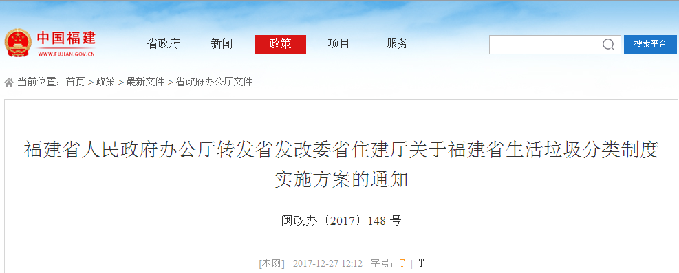 加快出臺垃圾分類實(shí)施辦法,福州市、廈門市2017年底前出臺生活垃圾分類辦法;其他設(shè)區(qū)市和平潭綜合實(shí)驗(yàn)區(qū)2018年底前出臺生活垃圾分類辦法或?qū)嵤┓桨浮?/p>