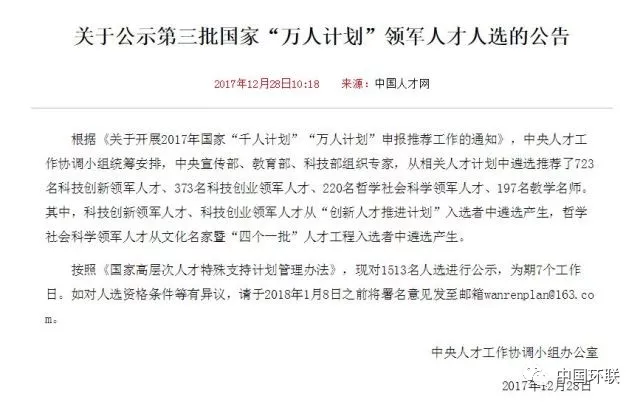 “萬人計劃”又名“國家高層次人才特殊支持計劃”,是一項面向國內(nèi)高層次人才的支持計劃。2012年國家“萬人計劃”啟動,目標是用10年時間,遴選1萬名左右自然科學、工程技術(shù)和哲學社會科學領(lǐng)域的杰出人才、領(lǐng)軍人才和青年拔尖人才,給予特殊支持。其中,“萬人計劃”領(lǐng)軍人才計劃支持8000名國家科技發(fā)展和產(chǎn)業(yè)發(fā)展急需緊缺的創(chuàng)新創(chuàng)業(yè)人才,包括科技創(chuàng)新領(lǐng)軍人才、科技創(chuàng)業(yè)領(lǐng)軍人才、哲學社會科學領(lǐng)軍人才、教學名師和百千萬工程領(lǐng)軍人才等類別。第三批“萬人計劃”領(lǐng)軍人才共有1513名各領(lǐng)域?qū)<胰脒x,其中723名科技創(chuàng)新領(lǐng)軍人才、373名科技創(chuàng)業(yè)領(lǐng)軍人才、220名哲學社會科學領(lǐng)軍人才、197名教學名師人選。