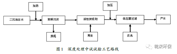 1.3工藝路線:中試試驗裝置的處理能力為1.5m3/h,安放在現(xiàn)場二沉池出水附近。工藝路線為,A2/O生化系統(tǒng)處理后的二沉池出水經(jīng)過加藥后進入絮凝沉淀反應器,上清液進入活性炭吸附罐,出水經(jīng)過加壓后進入4級串聯(lián)的低壓膜過濾罐,最終得到深度處理后的廢水,如圖1所示。