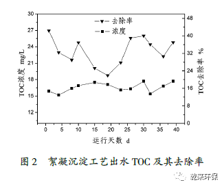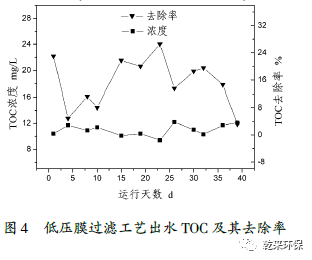 2.3低壓膜過濾工藝:活性碳纖維是碳纖維技術和活性炭技術相結合發(fā)展起來的新技術,具有過濾和吸附的雙重作用,國內外關于采用此工藝深度處理含有機物的廢水的報道逐漸增加。文章的低壓膜元件由高活性碳纖維制成,裝填在圓柱形過濾罐中,對比傳統(tǒng)的纖維束過濾工藝提高了對較小粒徑懸浮物的處理效果,同時較大的比表面積具備一定的吸附能力。主要工藝參數(shù)為,工作壓力為0.15~0.3MPa,孔隙率為85%,過水流量為3.5~4.5m3/(h˙m2)。低壓膜工藝出水TOC及其去除率如圖4所示,