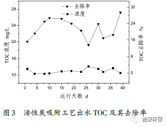 從圖中可以得出,活性炭吸附工藝出水TOC穩(wěn)定在12~14mg/L,去除效率保持在12%~32%之間,出水色度達到50倍以下,處理效果明顯。由于從A2/O系統(tǒng)的出水到進入活性炭吸附,經(jīng)過了兩級絮凝沉淀,因此有效的降低了活性炭負荷,在此試驗期間并沒有運行反洗和蒸汽再生程序。并且由于試驗操作規(guī)范,沒有發(fā)生物料流失的現(xiàn)象。