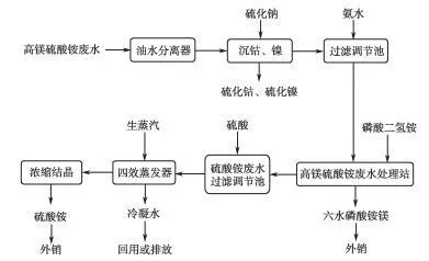 針對鈷冶煉中排出的高鎂硫酸銨廢水,以硫化鈉為沉淀劑去除鈷鎳,采用磷酸二氫銨除鎂+四效逆流降膜真空蒸發(fā)法組合工藝,可綜合回收硫化鈷與硫化鎳、磷酸銨鎂、硫酸銨,其中磷酸銨鎂和硫酸銨產(chǎn)品均達到國家一級標(biāo)準(zhǔn),最終廢水中氨氮≤ 8 mg/L。生產(chǎn)實踐表明:年處理30萬t高鎂硫酸銨廢水,可回收300 t硫化鎳鈷,1.6萬t六水磷酸銨鎂及4萬t硫酸銨,年銷售收入達600萬元以上,實現(xiàn)了高鎂氨氮廢水的資源化。