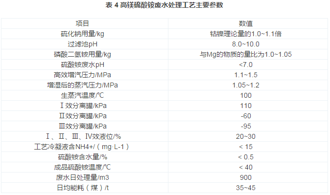 萃取單元產(chǎn)生的高鎂硫酸銨廢水預(yù)經(jīng)油水分離器除去有機相,然后用硫化鈉沉淀廢水中的鈷、鎳,濾渣返回生產(chǎn)系統(tǒng)再處理,濾液進入貯水池中,用氨水調(diào)節(jié)廢液pH至8.0~10.0,通過磷酸二氫銨除鎂至1 mg/L以下,固液分離后濾液用硫酸回調(diào)pH至7.0以下,進入四效逆流降膜蒸發(fā)器進行濃縮,結(jié)晶分離,最后制得硫酸銨產(chǎn)品。