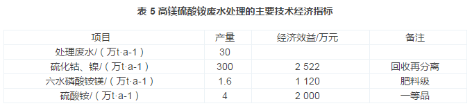 項目設(shè)計年處理30萬t高鎂硫酸銨廢水,年回收300 t硫化鎳鈷、1.6萬t磷酸銨鎂及4萬t硫酸銨產(chǎn)品,年利潤達600萬元以上,并達到了節(jié)水、節(jié)能、資源綜合利用的社會效益,其主要技術(shù)經(jīng)濟指標(biāo)如表 5所示。