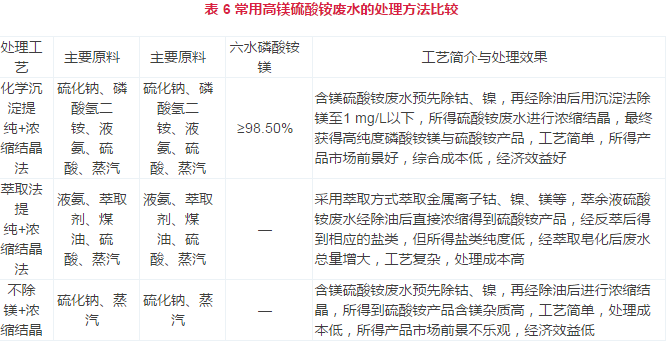 對目前常用的高鎂硫酸銨廢水處理方法進行比較,如表 6所示。