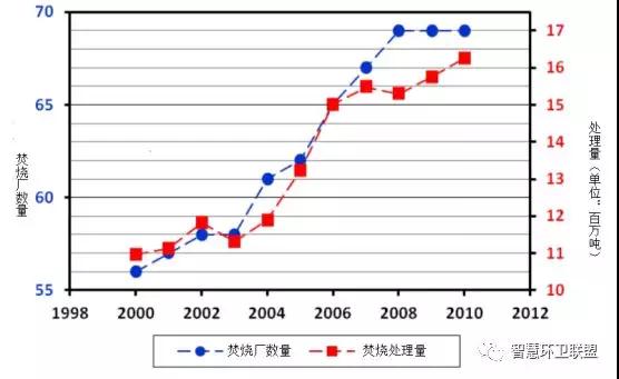 圖6.德國焚燒廠數量及焚燒處理量隨時間的變化