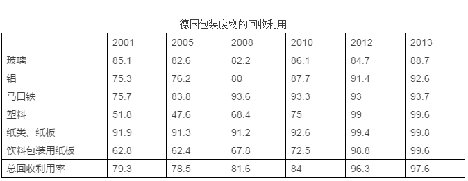 在德國,最常見的包裝材料有玻璃、鋁、馬口鐵、塑料、紙、紙板、木材,全部都能夠被用作二次原料,從而減少對原生原料的需求,可以起到降低能源消耗及污染排放的作用。根據《包裝條例》的規(guī)定,居民應當對包裝廢物進行分類投放。條例獲得了廣泛的公眾支持,2013年時德國包裝廢物的回收利用率達到了97%。