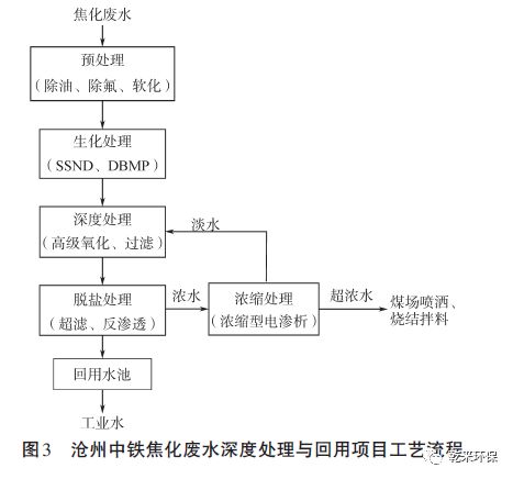 (1)預(yù)處理。4 股廢水在進(jìn)入生化系統(tǒng)前,先分別進(jìn)行預(yù)處理,低濃度焦化廢水和LNG 生產(chǎn)排水采用氣浮除油,循環(huán)排污水采用化學(xué)軟化,蒸氨廢水采用結(jié)晶除氟。其中,蒸氨廢水的氟離子含量高,在深度處理的脫鹽系統(tǒng)中易形成氟化鈣沉淀,難以化學(xué)清洗,在已往的工藝設(shè)計(jì)中經(jīng)常被忽視。項(xiàng)目采用結(jié)晶除氟反應(yīng)器,加入除氟劑,劇烈攪拌,廢水中的氟離子形成晶體沉淀得以去除,有效降低了后續(xù)脫鹽系統(tǒng)無機(jī)鹽結(jié)垢的風(fēng)險(xiǎn)。(2)生化處理。采用SSND(間歇式同步硝化反硝化工藝)和DBMP(反硝化協(xié)同生物倍增工藝)兩種工藝前后串聯(lián),作為兩級(jí)生化處理系統(tǒng)。間歇式運(yùn)行、變頻控制曝氣量,適應(yīng)焦化廢水水質(zhì)波動(dòng)大的特點(diǎn),抗沖擊能力強(qiáng)。僅憑生化處理,可使COD降低到150 mg/L以下。(3)深度處理。采用Fenton 氧化原理的均相催化氧化工藝和錳砂、多介質(zhì)兩級(jí)過濾,使出水COD≤50 mg/L,濁度≤1 NTU。(4)脫鹽處理。經(jīng)過前期的各級(jí)處理,脫鹽工藝可長期穩(wěn)定運(yùn)行,產(chǎn)水直接回用于工業(yè)水系統(tǒng),濃水進(jìn)入濃縮處理系統(tǒng)。(5)濃縮處理。采用濃縮型電滲析對(duì)反滲透濃水進(jìn)行再濃縮,提高凈水回收率,最大限度地減少濃水產(chǎn)生量,超濃水用于煤場噴灑和燒結(jié)拌料。