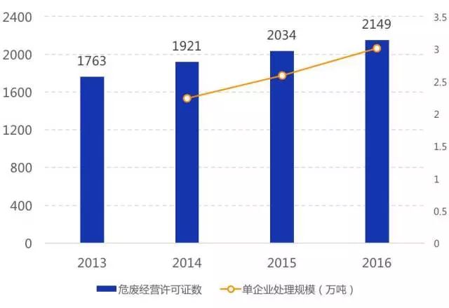 資質(zhì)企業(yè)平均規(guī)模較?。?016年我國持危險廢棄物經(jīng)營許可證的企業(yè)數(shù)量為2149家,2016年凈增加僅115家,體現(xiàn)出環(huán)保系統(tǒng)對新頒發(fā)許可證愈發(fā)謹慎;平均每家處理量僅不到3萬噸,呈現(xiàn)較強的分散性特征,但單企業(yè)處理規(guī)模由2014年2.2萬噸/年增加到2016年3.0萬噸/年,未來隨著許可證頒發(fā)與復(fù)核難度加大,實力弱、技術(shù)差的小企業(yè)將被淘汰出市場,龍頭擴張,單企業(yè)規(guī)模繼續(xù)擴大。