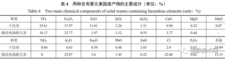 鋼廠每年產(chǎn)生含鉀、鈉、鋅等有害元素的固體廢棄物約 8.5 萬(wàn)噸,表 4 是兩種典型產(chǎn)物的檢測(cè)成分。