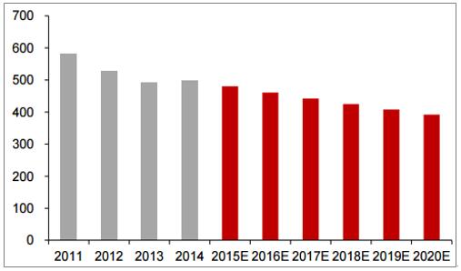 由于環(huán)保政策的更新和更加嚴(yán)格,2011年全國(guó)工業(yè)污水處理費(fèi)用為1.26元/噸,根據(jù)我們預(yù)測(cè)2020年單位工業(yè)污水處理費(fèi)用將達(dá)到1.94元/噸。2011年全國(guó)污水處理總量為580億噸,2011年至2014年全國(guó)工業(yè)污水總處理量成持續(xù)下降趨勢(shì),CAGR為-3.97%。以此趨勢(shì),我們估計(jì)2020年全國(guó)工業(yè)污水處理總量將減少至391億噸,屆時(shí)全國(guó)工業(yè)污水處理市場(chǎng)將達(dá)到759億元規(guī)模,由于處理成本增速大于工業(yè)污水處理總量的降幅,行業(yè)總體呈現(xiàn)逐年平穩(wěn)增加趨勢(shì)。