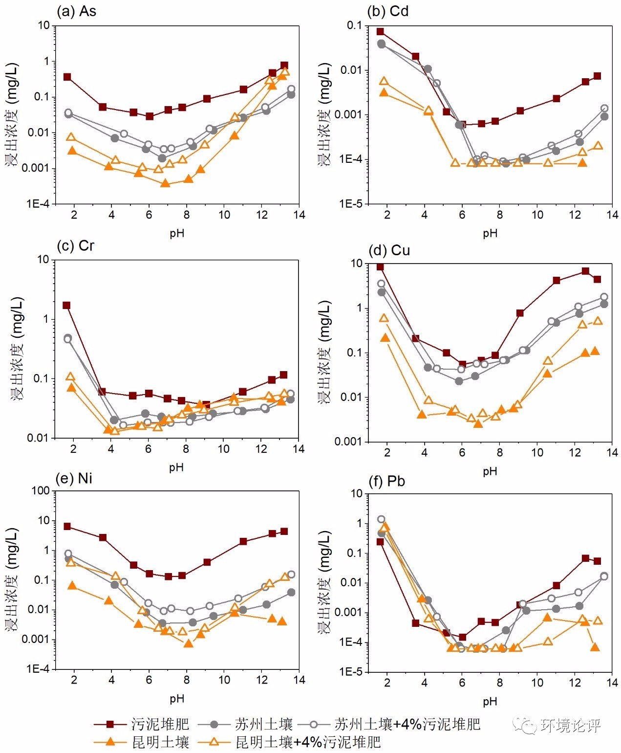 圖2 土壤、污泥堆肥、土壤和污泥堆肥混合物中重金屬As、Cd、Cr、Cu、Ni、Pb的浸出濃度隨pH的變化規(guī)律。