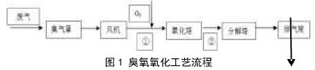 試驗(yàn)裝置工藝流程如圖1所示。廢氣在①管路與O3混合后進(jìn)入氧化塔與O3發(fā)生氧化反應(yīng)后,再經(jīng)②管路進(jìn)入臭氧分解塔,分解剩余O3后完成對(duì)廢氣的凈化,達(dá)到排放標(biāo)準(zhǔn),經(jīng)排氣管排放。具體流程見(jiàn)工藝流程圖1。