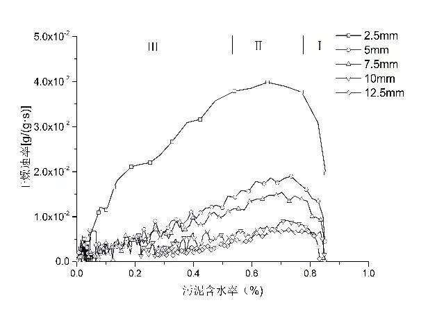 由圖3可知,污泥的干燥速率隨著含水率的變化而改變,大致可以分為:預(yù)干燥階段,恒速干燥階段和降速干燥階段。在含水率區(qū)間Ⅰ內(nèi),干燥過程處于預(yù)熱階段,隨著溫度提高,干燥速率有迅速增高的趨勢;Ⅱ區(qū)間內(nèi),加熱板輸出的熱量主要用于自由水的轉(zhuǎn)移與蒸發(fā),污泥表面的水分蒸發(fā)速率與污泥內(nèi)部水分擴散速率相當,干燥速率波動較為平穩(wěn),可近似看作恒速干燥;Ⅲ區(qū)間內(nèi),隨著含水率逐漸降低,污泥中的間隙水與吸附水開始減少,擴散阻力增加,干燥速率減慢,即降速干燥階段。