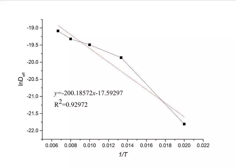 由式(7)可知,ln Deff與1/T成線性關(guān)系。由圖5可知,是直線的斜率,lnD0是直線的截距。經(jīng)計算,活化能Ea=1.664 kJ/mol,D0=2.288×10-8 m2/s。