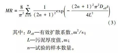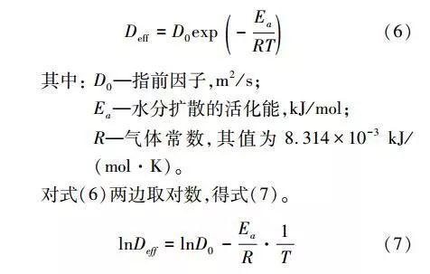 有效擴散系數(shù)污泥的干燥過程可以簡化為污泥內(nèi)部水分向外界的擴散過程,描述物質(zhì)擴散的Fick定律可用來計算污泥中水分的擴散系數(shù),擴散系數(shù)與溫度和含水率的關(guān)系由式(3)給出。