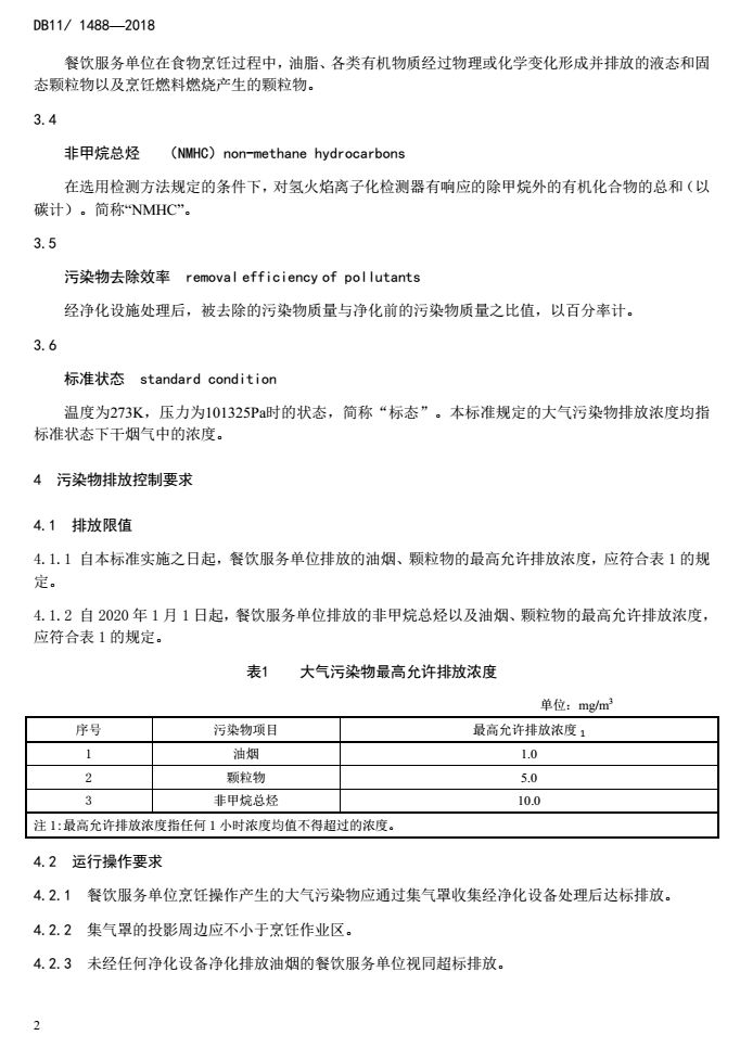 標(biāo)準(zhǔn)規(guī)定了餐飲服務(wù)單位排放的油煙、顆粒物和非甲烷總烴(注:“非甲烷總烴”為表征“揮發(fā)性有機(jī)物”,簡稱“VOCs”的一種指標(biāo))三項(xiàng)污染物的排放限值,明確了三項(xiàng)污染物的監(jiān)測要求和分析測定方法,提出了凈化設(shè)備的運(yùn)行操作要求,從而全面控制餐飲業(yè)的大氣污染排放。該標(biāo)準(zhǔn)于2018年1月8日發(fā)布,并將于2019年1月1日起實(shí)施,其中油煙和顆粒物限值自標(biāo)準(zhǔn)實(shí)施之日起執(zhí)行,非甲烷總烴限值自2020年1月1日起執(zhí)行。
