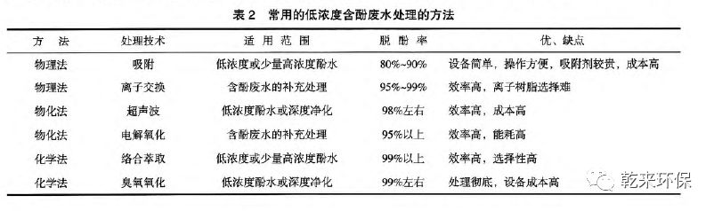 5.1物化預處理:根據(jù)工程經(jīng)驗,經(jīng)過生化法處理的廢水含酚量應該低于300 mg/l。且水中不得含有氨、焦油或油類物質,否則就會抑制微生物的生長,影響對污染物的分解,甚至造成微生物的中毒死亡,降低廢水的處理效果。廢水中的酚類和油類物質同屬有機物,具有“相似相容”的性質,而酚還屬于Lewis酸,易與極性水分子之間形成氫鍵,增加其在水中的溶解度,進而促進油水的惡性乳化。因此,對酚類和油類物質的去除過程存在嚴重的相互干擾,需要通過分步交替處理以便使廢水中的污染物達到可生化處理要求。(1)脫酚工業(yè)生產(chǎn)中,酚濃度為1 000 mg/l以上的廢水稱為高濃度含酚廢水,回收利用其中的酚類物質可增加廢水處理的經(jīng)濟效益。目前,工業(yè)上常用來處理高濃度含酚廢水的方法主要集中在物理分離方法,如:蒸汽吹脫除酚、溶劑萃取脫酚等。結合本文煤焦油加氫主體裝置的操作特點,在處理煤焦油加氫廢水時可優(yōu)先采用溶劑萃取方法脫酚,且為降低萃取劑的分離成本,所選用的溶劑應盡量從煤焦油分餾系統(tǒng)或煤焦油加氫系統(tǒng)的中間產(chǎn)物或產(chǎn)品中選取。經(jīng)模擬計算,本文中煤焦油加氫裝置廢水中的酚可由20 000降低到1 500mg/1以下。在工程實踐中,可用于進行低濃度含酚廢水處理的方法較多(見表2),需結合主體裝置的操作特點,選擇操作方便、投資成本和運行費用低的脫酚技術。