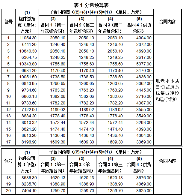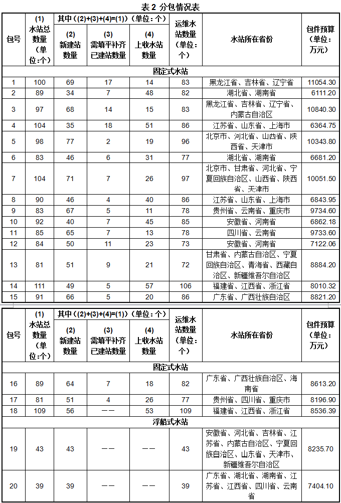 7. 招標(biāo)內(nèi)容為:招標(biāo)人計(jì)劃采購1087個(gè)國家地表水自動(dòng)監(jiān)測站(以下簡稱水站)的建設(shè)及其三年運(yùn)維服務(wù)、531個(gè)已建水站的三年運(yùn)維服務(wù)、135個(gè)國家已建水站的儀器設(shè)備填平補(bǔ)齊。其中,1~18包為固定式水站,19~20包為浮船式水站。具體要求詳見第四章技術(shù)需求書。