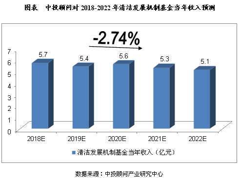 2016年,清潔發(fā)展機(jī)制基金當(dāng)年收入為6.27億元,同比減少0.56億元。我們預(yù)計(jì),2018年清潔發(fā)展機(jī)制基金當(dāng)年收入將達(dá)到5.7億元,未來(lái)五年(2018-2022)年均復(fù)合增長(zhǎng)率約為-2.74%,2022年清潔發(fā)展機(jī)制基金當(dāng)年收入將達(dá)到5.1億元。