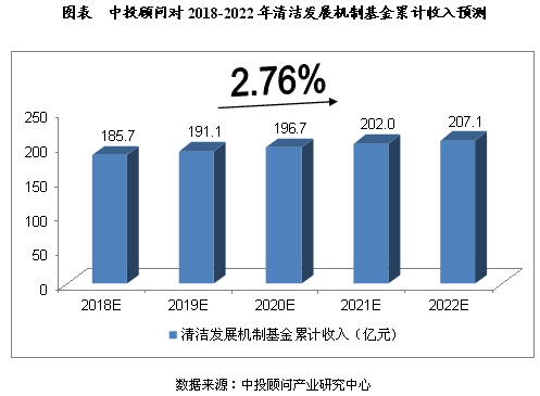 2016年,清潔發(fā)展機(jī)制基金累計(jì)收入為174.04億元,同比增長(zhǎng)3.74%。我們預(yù)計(jì),2018年清潔發(fā)展機(jī)制基金累計(jì)收入將達(dá)到185.7億元,未來(lái)五年(2018-2022)年均復(fù)合增長(zhǎng)率約為2.76%,2022年清潔發(fā)展機(jī)制基金累計(jì)收入將達(dá)到207.1億元。