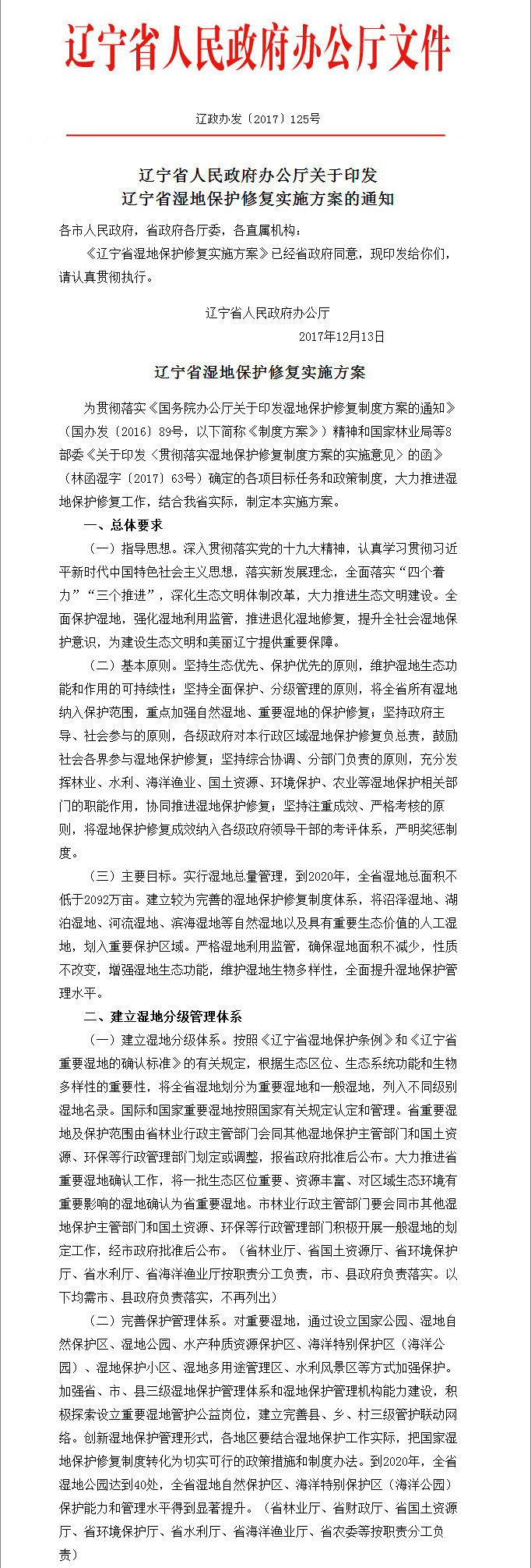 《遼寧省濕地保護(hù)修復(fù)實(shí)施方案》于日前印發(fā),旨在全面保護(hù)濕地,建立較為完善的濕地保護(hù)修復(fù)體系,詳情如下: