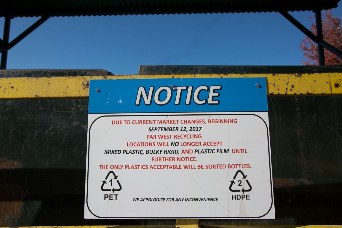 ▲美國希爾斯伯勒的垃圾回收站貼出了通知:因?yàn)槭袌鲎兓?,不再接收混合塑料等,唯一接收的塑料只是分選的塑料瓶。(視覺中國/圖)