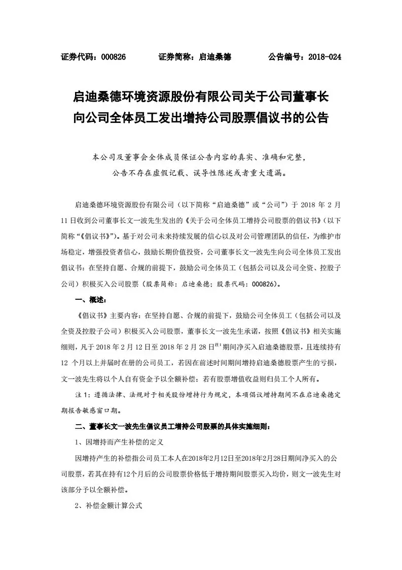今2月11日,啟迪桑德發(fā)布一則重磅公告,基于對公司未來持續(xù)發(fā)展的信心以及對公司管理團(tuán)隊(duì)的信任,為維護(hù)市場穩(wěn)定,增強(qiáng)投資者信心,鼓勵長期價值投資,文一波董事長以個人名義向公司全體員工發(fā)出倡議書。