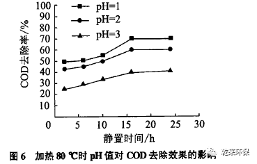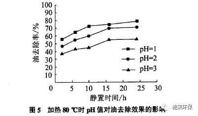 從圖3和圖4可以看出,加酸破乳比加熱破乳效果更明顯,油的去除率最高可以達(dá)到73%,COD的去除率可以達(dá)到64%。試驗(yàn)過程中加入硫酸調(diào)整pH值,加入酸后震蕩1 min,水面明顯出現(xiàn)一層油,但是比單純加熱產(chǎn)生的浮油顏色淺,呈黃色,這說明加酸后破壞了乳化液,形成了有機(jī)酸而使油水分離。而且pH值越低,產(chǎn)生的浮油量越多,浮油出現(xiàn)的速度也越快。隨著靜置時(shí)間的增加,pH值越低錐形瓶?jī)?nèi)乳化液分層越明顯。靜置10 h以上,pH值為1、2的錐形瓶底部出現(xiàn)一層透明的清液,中間大部分是混濁的乳白色,上部一層黃色浮油,pH=3的錐形瓶底部沒有明顯的透明清液。建議酸化破乳pH值控制在1—2。