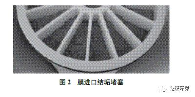 為減少蒸發(fā)量,部分廠家采用RO 膜技術(shù)進行濃縮。煤化工廢水TDS濃度約為3 000 mg ˙ L-1,硬度約為300 mg ˙ L-1,COD 約為300 mg ˙L-1。在高濃縮比的工況下,長時間運行會對膜進口和膜面產(chǎn)生污染。因此需投加藥劑除硬,增加了污泥外置費用。卷式RO 膜無法進一步提高濃縮比的主要原因有兩個:第一是卷式RO 膜的進入通道較窄,第二是其膜面剪切力不足。RO 膜進口結(jié)垢堵塞情況見圖2。