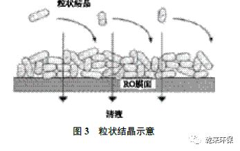3.2膜面結(jié)晶:膜面結(jié)晶是RO 膜應(yīng)用的重要議題。按結(jié)晶理論,結(jié)晶狀態(tài)通常可分為粒狀結(jié)晶和膜面結(jié)晶。當溶液達到溶解度極限范圍時,分子相互碰撞產(chǎn)生晶體,晶體是不溶解的粒狀固體,隨水流方向壓到膜面上。粒狀晶體堆在膜面上比較松散,或隨著水流沖到濃液出口,因此粒狀結(jié)晶不會對膜通量帶來太大影響。粒狀結(jié)晶見圖3。