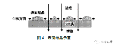 膜面結(jié)晶是鹽水在通過膜面時進行脫鹽,水被壓過膜產(chǎn)生清液,膜面瞬時在高鹽濃度下結(jié)晶(見圖4)。