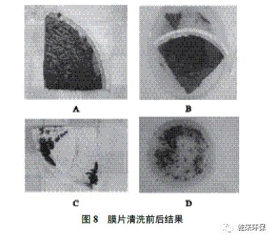由表1 和表2 可知,震動膜產(chǎn)水水質(zhì)滿足回用要求,但膜通量和清洗周期還未達到設(shè)計標準。圖8 為膜面在清潔前后的觀察結(jié)果。