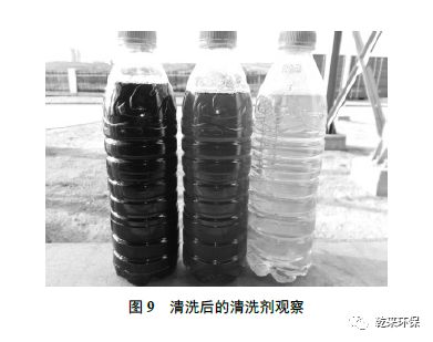 圖8 中A、B 膜片在清洗前發(fā)現(xiàn)有大量膠狀有機物,通過化學清洗后可以恢復潔白(如圖8C 所示),清洗出來的殘余物D 為塊狀物質(zhì)。因而化學清洗可以令膜再生。但實際上該膜組的清洗程度并不夠。通過對該項目正運行的膜組連續(xù)進行三次化學清洗,每次對清洗浸泡液取樣觀察(見圖9)。