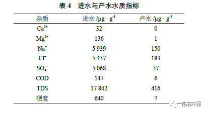 由圖10 可知,微濾處理后,SDI 值由3 500 降至85,整體膜通量和清洗周期得到質(zhì)的改善。采用100 h 作為清洗周期,可滿足原設(shè)計標準要求。表4 為另一煤化工項目廢水“零排放”震動膜膜濃縮案例的進水與產(chǎn)水水質(zhì)指標。