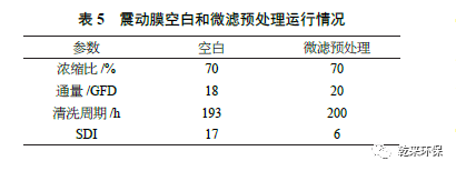 該項目震動膜空白和微濾預處理運行情況比較見表5。