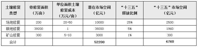 同樣對多方信息進行綜合分析,保守估計我國的待修復礦山污染地塊在300萬畝左右,保守估計以每畝地5-10萬元左右價格垃圾進行估算,則礦山修復市場空間將達到3000億元左右。