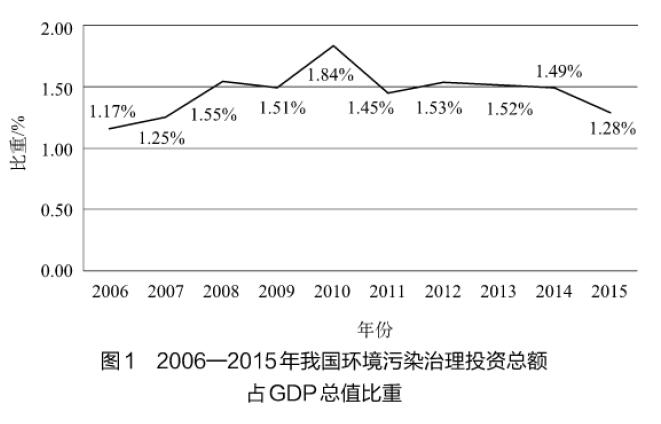我國環(huán)保投資水平大大低于發(fā)達(dá)國家。發(fā)達(dá)國家的經(jīng)驗(yàn)是:當(dāng)一個(gè)國家的環(huán)保投資占GDP比例在1%~2%時(shí),至多只能防止環(huán)境狀況的進(jìn)一步惡化;而要使環(huán)境質(zhì)量發(fā)生明顯的好轉(zhuǎn),環(huán)保投資額要占到同期GDP的3%~5%。2011年英國環(huán)保投資占GDP比重為5.28%,法國為5.27%,意大利為3.14%,日本為6.17%。而我國環(huán)境污染治理投資額占GDP比重近十年來總體保持較低水平,基本為1.15%~1.85%,2010年之后甚至出現(xiàn)較明顯的下降,2015年環(huán)境污染治理投資占GDP比重降至1.28%,如圖1所示。