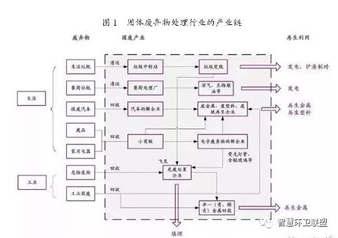 固體廢棄物主要來自于居民生活和工業(yè)生產(chǎn),數(shù)量巨大,品種繁多,要求相應(yīng)的處理手段嚴(yán)格,可重復(fù)利用程度較高。固體廢棄物通過填埋、焚燒、堆肥、回收利用或者循環(huán)再生方式進(jìn)行無害化處理。固體廢棄物處理行業(yè)的產(chǎn)業(yè)鏈如下圖所示。