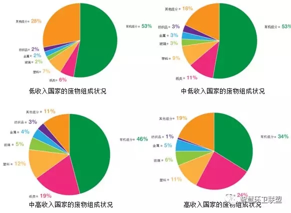 無論收入水平如何,金屬、玻璃、織物等物料在廢物總量中所占比例都較低,但如果將它們統(tǒng)一歸為“不含水的可循環(huán)利用物料”,就可以看出,按照收入水平的提升,其比例出現(xiàn)了小幅但卻穩(wěn)步的提升,從低收入國家的6%,到中低收入國家的9%,最后到中高收入和高收入國家的12%。