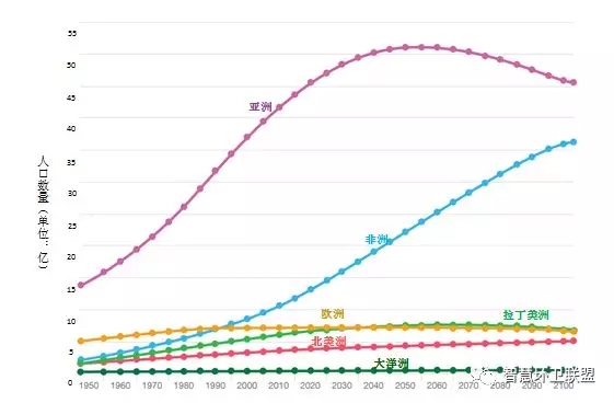聯(lián)合國的《世界人口展望》對全球未來的人口直到2100年的趨勢做出了預(yù)測,雖然報告中對未來30年以后的趨勢做出了差別較大的多種預(yù)測,但仍然能夠看出未來全球人口發(fā)展的總體趨勢將會是,首先上升,之后趨于平穩(wěn),最后既有可能達到平衡狀態(tài),也有可能開始下降。根據(jù)預(yù)測,亞洲的人口將會在2050年左右達到峰值,而非洲人口則會一直到2100年維持增長的趨勢。圖4展示了全球各地區(qū)自1950年起,到2100年的變化趨勢。